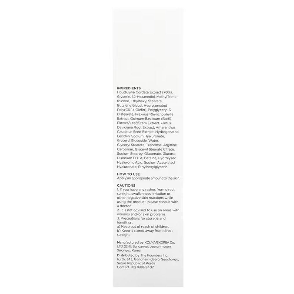Acqua, Glicerina,1,2-Esandiolo, Butilene Glicole, Estratto di Houttuynia Cordata, Gliceril Stearato, Arginina, Carbomero, Etilesilglicerina, Stearoil Glutammato di Sodio, Glucosio, Estratto di radice di Ulmus Davidiana, Estratto di semi di Amaranthus Caudatus, Lecitina idrogenata, Tocoferolo, Acido ialuronico idrolizzato, Sodio ialuronato acetilato, Etilexil stearato, Trealosio, Estratto di Laminaria Japonica, Estratto di foglie di Eclipta Prostrata, Sodio ialuronato cutaneo, Beta-Glucano, Betaina, Ficus Carica (Fico) Estratto di frutta, Gliceril Glucoside, Gliceril Stearato Citrato, Poligliceril-3 Distearato, Squalano, Frutto-oligosaccaridi, Poli idrogenato (C6-14 Olefina), Butyrospermum Parkii (Burro di Karitè), Estratto di Centella Asiatica, Metilpropanediolo, Estratto di Fraxinus Rhynchophylla, Ceramide Np, Cetearyl Glucoside, Estratto di fiori/foglie/steli di Ocimum Basilicum, EDTA disodico, Ialuronato di sodio, Trimeticone metilico, Trigliceride caprilico/caprico, Alcool cetearilico, Glicole dipropilenico.