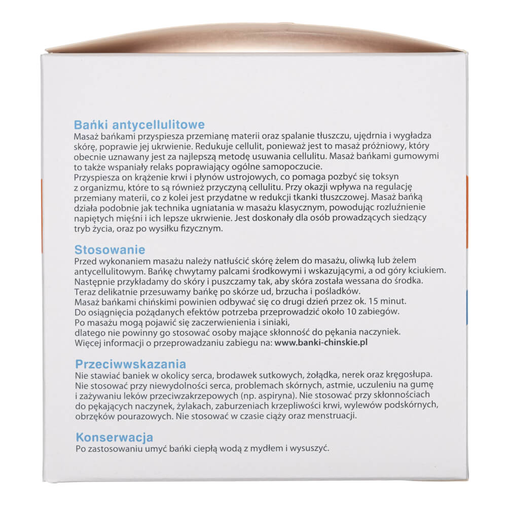 Le bolle di gomma cinesi possono essere utilizzate per l'agopuntura e il massaggio , compreso l'anticellulite . Sono facili da usare. Possono essere posizionate ovunque sul corpo . Sono realizzate in plastica flessibile e più facili da usare rispetto alle tradizionali bolle di vetro. Il massaggio con le bolle accelera il metabolismo e la combustione dei grassi, rassoda e leviga la pelle . Riduce la cellulite perché è un massaggio sottovuoto , attualmente considerato il metodo migliore per eliminare la cellulite. Le cabine sottovuoto sono sempre più diffuse nei saloni di bellezza. Se il contenuto del vostro portafoglio non vi permette di utilizzare tali trattamenti, le bolle cinesi sono la soluzione migliore.