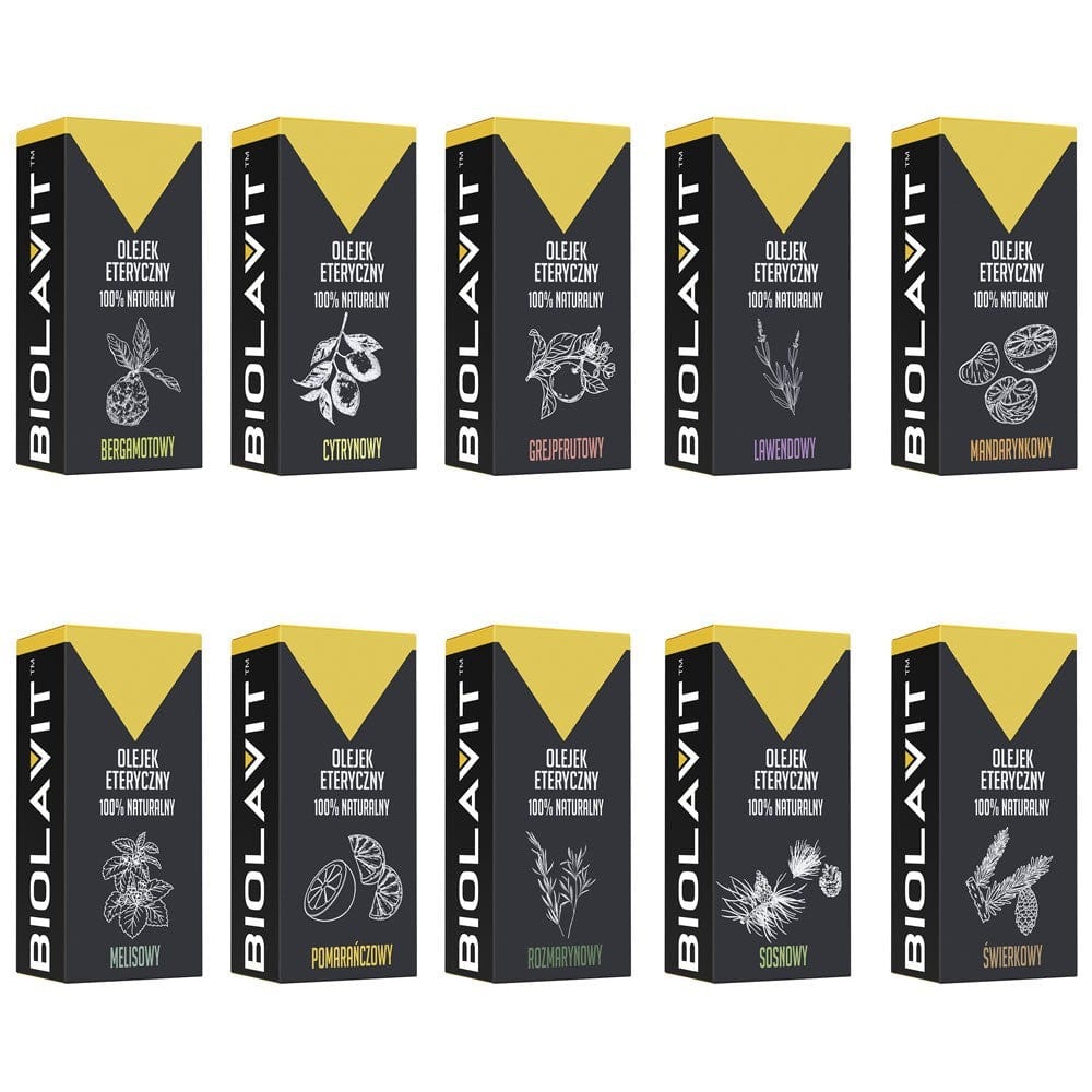 Set di 10 oli essenziali di Bilovit. Il set comprende oli essenziali di bergamotto, limone, pompelmo, lavanda, mandarino, melissa, arancia, rosmarino, abete rosso, e pino.