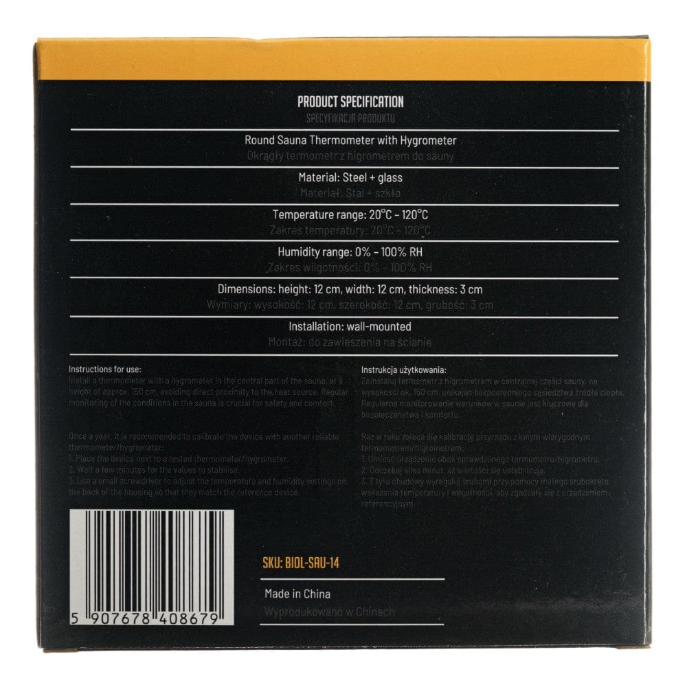 Il termometro rotondo per sauna Bilovit con igrometro è un elegante strumento per misurare con precisione la temperatura (20-120 °C) e l'umidità (0-100%) nella sauna. Realizzato in acciaio resistente e vetro, assicura longevità e un aspetto elegante. Le sue dimensioni compatte (12 x 12 x 3 cm) e la facilità di installazione ad un'altezza di 150 cm lo rendono il complemento perfetto per qualsiasi sauna, garantendo un soggiorno confortevole e sicuro.