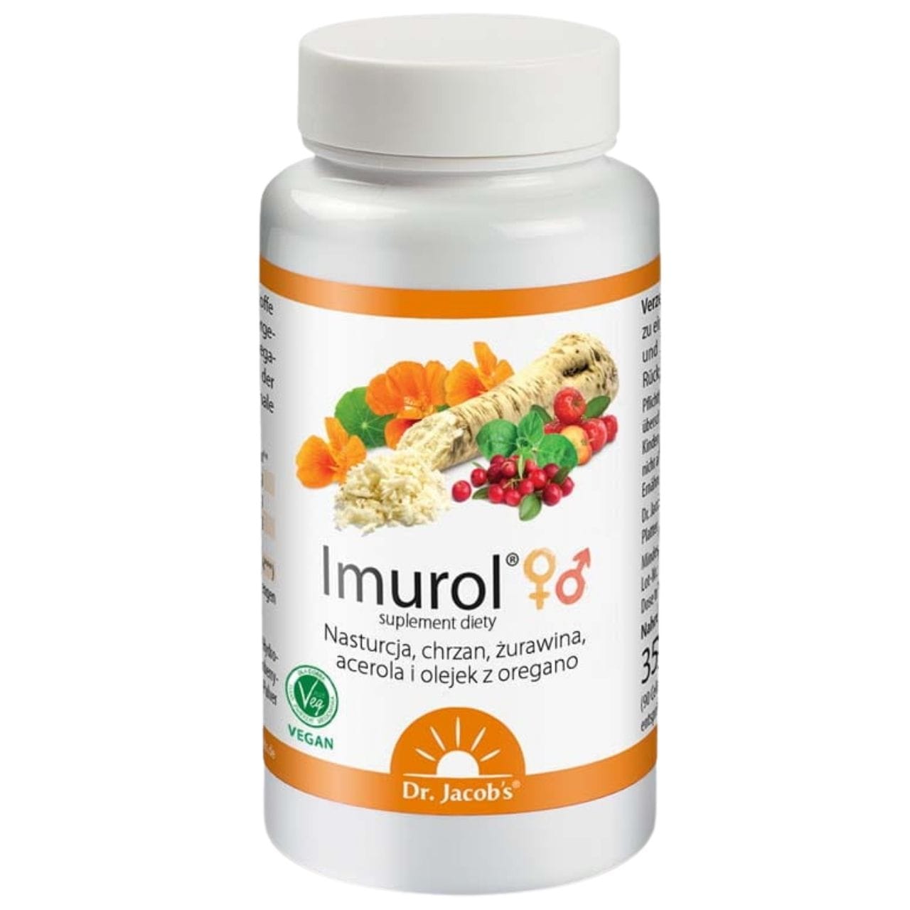 Dr. Jacob's Imurol è un integratore alimentare in capsule vegane contenente -polvere di nasturzio, rafano in polvere, estratto di mirtillo rosso, olio di origano e estratto di acerola come fonte di vitamina C (40 mg — 50% della RDA) per dose giornaliera (3 capsule). La vitamina C contribuisce al normale funzionamento del sistema immunitario e protegge le cellule dallo stress ossidativo. Il prodotto è vegano e senza glutine. Informazioni nutrizionali: