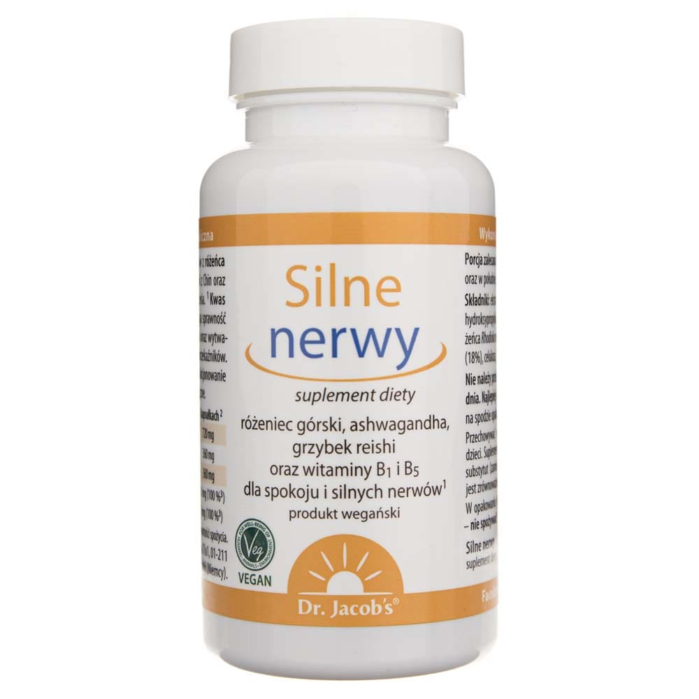 Nervi forti di Dr. Jacob's è un integratore alimentare in forma di capsule di cellulosa contenente: rodiola rosea , ashwagandha , fungo reishi e vitamine B1 e B5 per nervi calmi e forti.