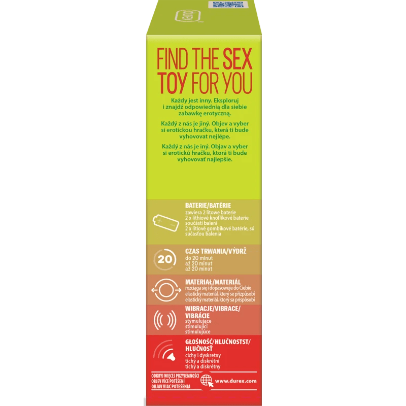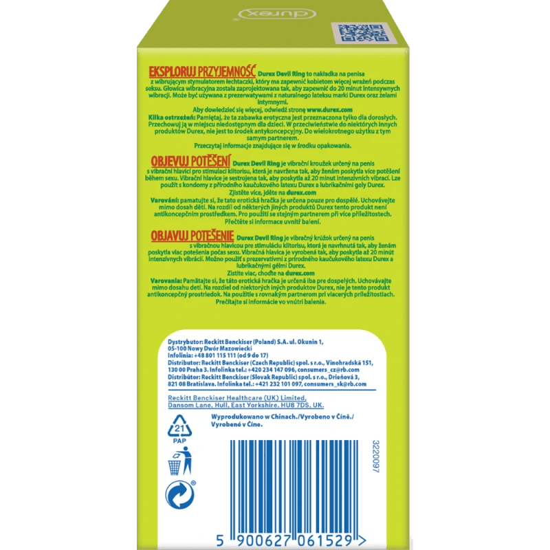 Durex Devil Ring è un cuscinetto per pene con stimolatore clitorideo vibrante progettato per dare alle donne maggiori sensazioni durante il sesso. La testa vibrante è progettata per fornire fino a 20 minuti di vibrazioni intense. Può essere utilizzato con i preservativi in lattice naturale e i gel intimi del marchio Durex.