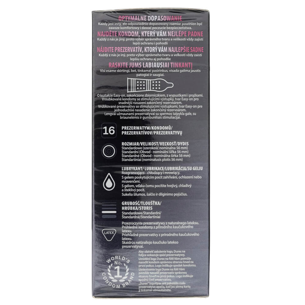 Conservanti Durex Intense Orgasmic con linguette e striature , e gel stimolante Intense offrono sensazioni più intense per lei e soddisfazione per entrambi.
