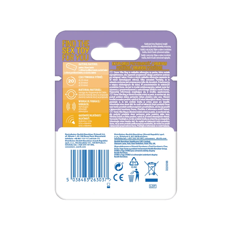 Durex Intense Vibrations è un cuscinetto massaggiante di piccole dimensioni a forma di anello vibrante. È un piccolo gadget erotico che può portare una certa ventata di aria fresca in qualsiasi camera da letto, ma può anche rivelarsi un gadget interessante e utile per un uso regolare. Con un singolo utilizzo, può durare fino a 20 minuti fornendo un'esperienza indimenticabile per entrambi i partner emettendo vibrazioni delicate e potenti allo stesso tempo. Si tratta di un prodotto offerto dal leader mondiale nella categoria dei prodotti che arricchiscono la vita sessuale - il noto e rispettato marchio Durex. L'anello è realizzato con prodotti sicuri e di altissima qualità. L'aspetto di questo topper può essere poco appariscente e non degno di nota. Tuttavia, questo anello vibrante fa parte di una serie di gadget erotici che permettono di migliorare le sensazioni, rafforzare la sensazione di piacere e combattere efficacemente la noia della vita sessuale. Con l'uso del tappo, il piacere può essere percepito in modo più forte e chiaro, che si traduce in definitiva in una maggiore qualità della vita sessuale .