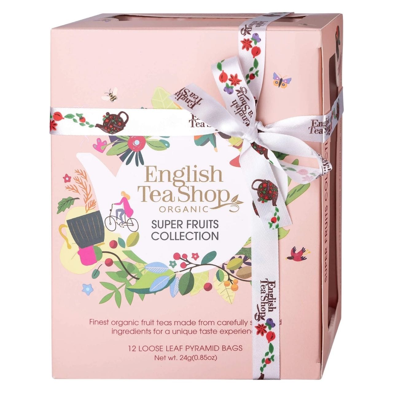 La collezione Super Frutti di English Tea Shop è un set di 12 bustine piramidali, contenenti due bustine per ciascuno dei sei gusti di frutta ed erbe aromatiche. Ogni miscela è stata creata per fornire un ricco apporto di vitamine e aromi naturali provenienti da frutta, erbe e spezie biologiche. Tutti i tè provengono da aziende agricole biologiche certificate e sono confezionati in bustine piramidali biodegradabili. L'elegante confezione, che ricorda una lussuosa scatola di cioccolatini, rende questo set il regalo perfetto per ogni occasione.