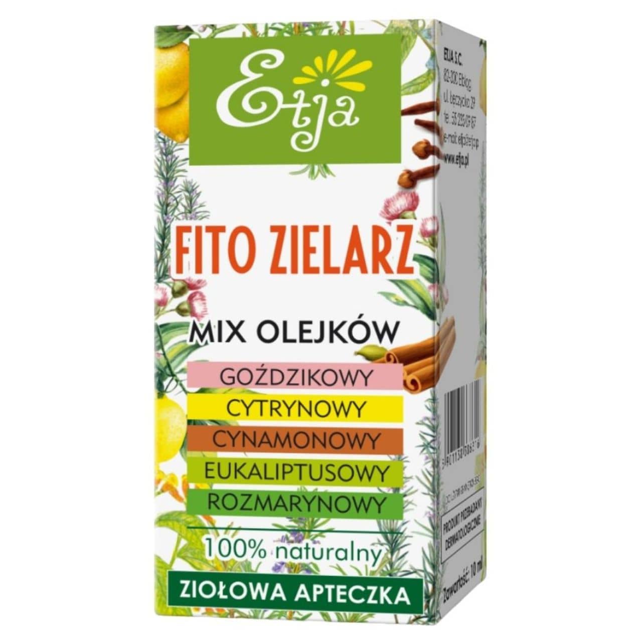 Fito Zielarz è una miscela professionale di 5 oli essenziali naturali : limone, cannella, eucalipto, chiodi di garofano e rosmarino. Riscaldante e rinfrescante , con un intenso aroma speziato-agrumato. Rafforza il sistema immunitario, aiuta a combattere le infezioni delle vie respiratorie e i dolori reumatici. Formula certificata 100% naturale ,!