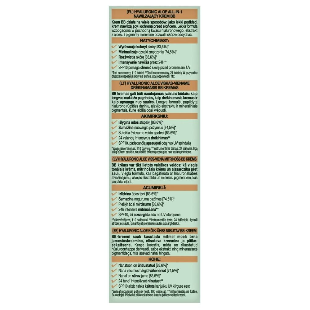 Garnier BB Cream è un prodotto multifunzionale che unisce le proprietà di un fondotinta leggero, idratante e di una protezione solare. La sua formula leggera, arricchita con un derivato dell'acido ialuronico, estratto di aloe vera e pigmenti minerali, permette alla pelle di respirare ed è adatta a tutti i tipi di pelle. La BB cream uniforma istantaneamente il tono della pelle, minimizza i segni di stanchezza, illumina l'incarnato e idrata intensamente per 24 ore, fornendo al contempo una protezione SPF10 .