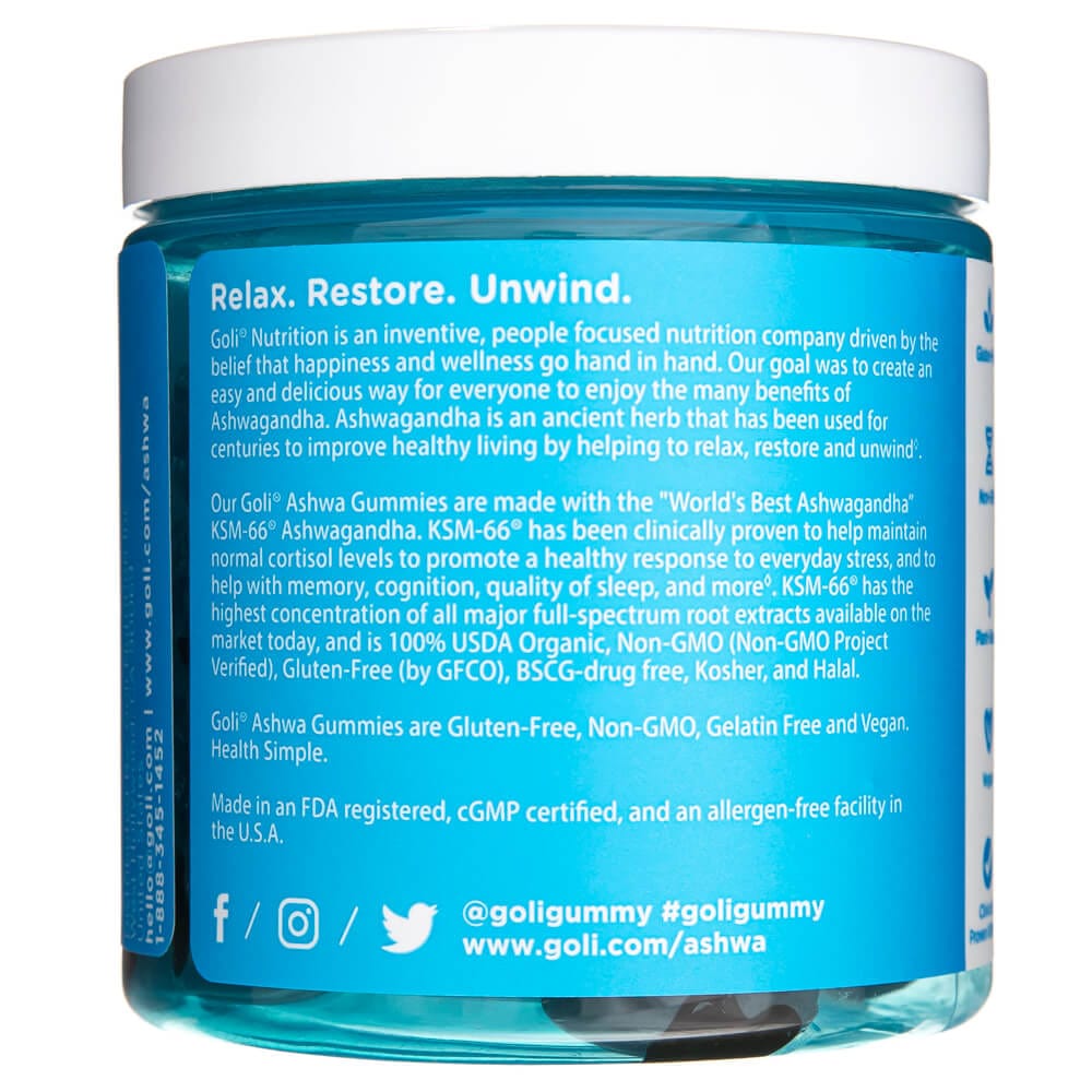 Ashwagandha di Goli Nutrition è un integratore alimentare in caramelle gommose al gusto di frutti di bosco contenente estratto di radice di Ashwagandha KSM-66 ®. La formula è inoltre arricchita con vitamina D2.