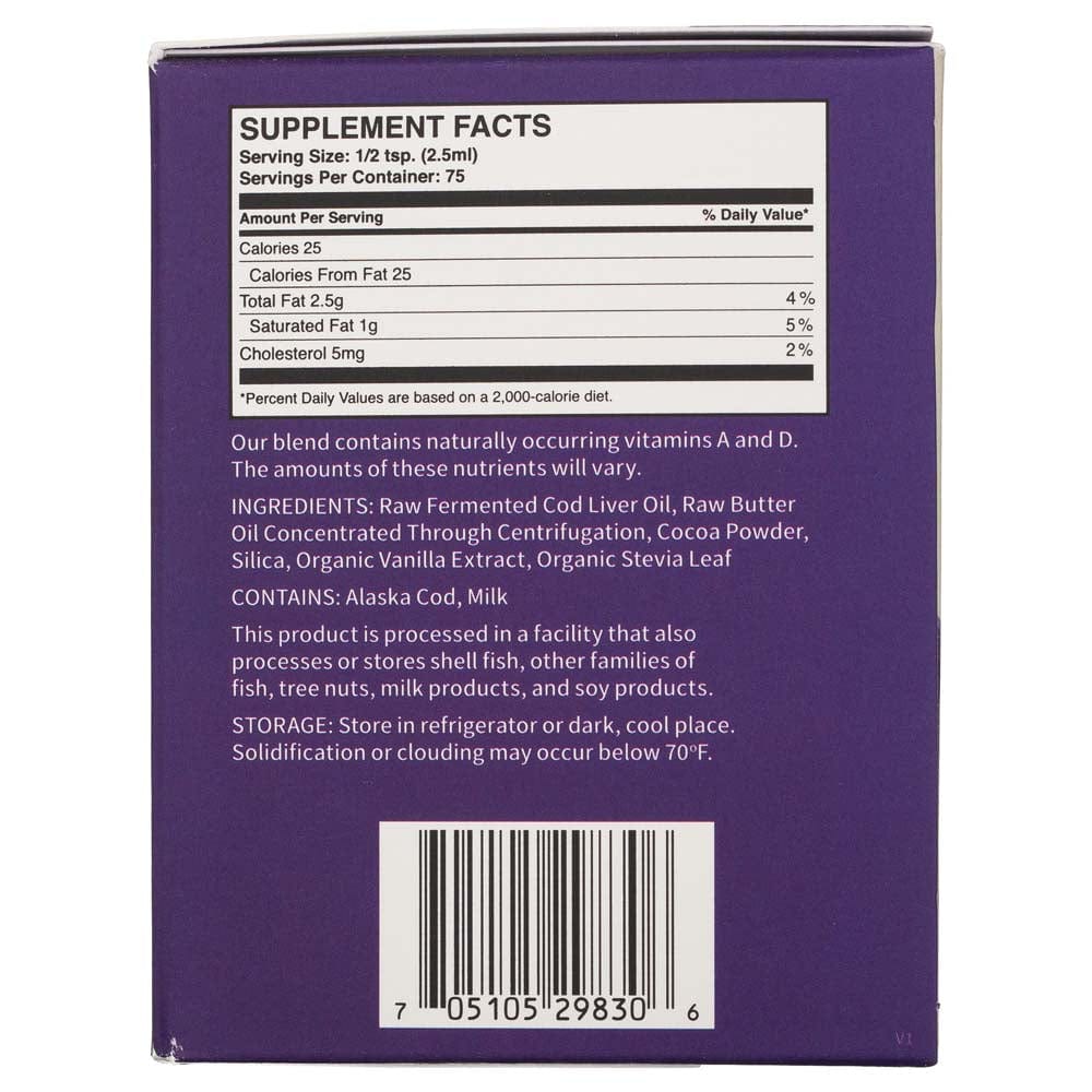 RAW Olio di fegato di merluzzo fermentato , RAW Olio di burro concentrato mediante centrifugazione , Cacao in polvere , Estratto di vaniglia biologica , Silice , Foglie di stevia biologica .