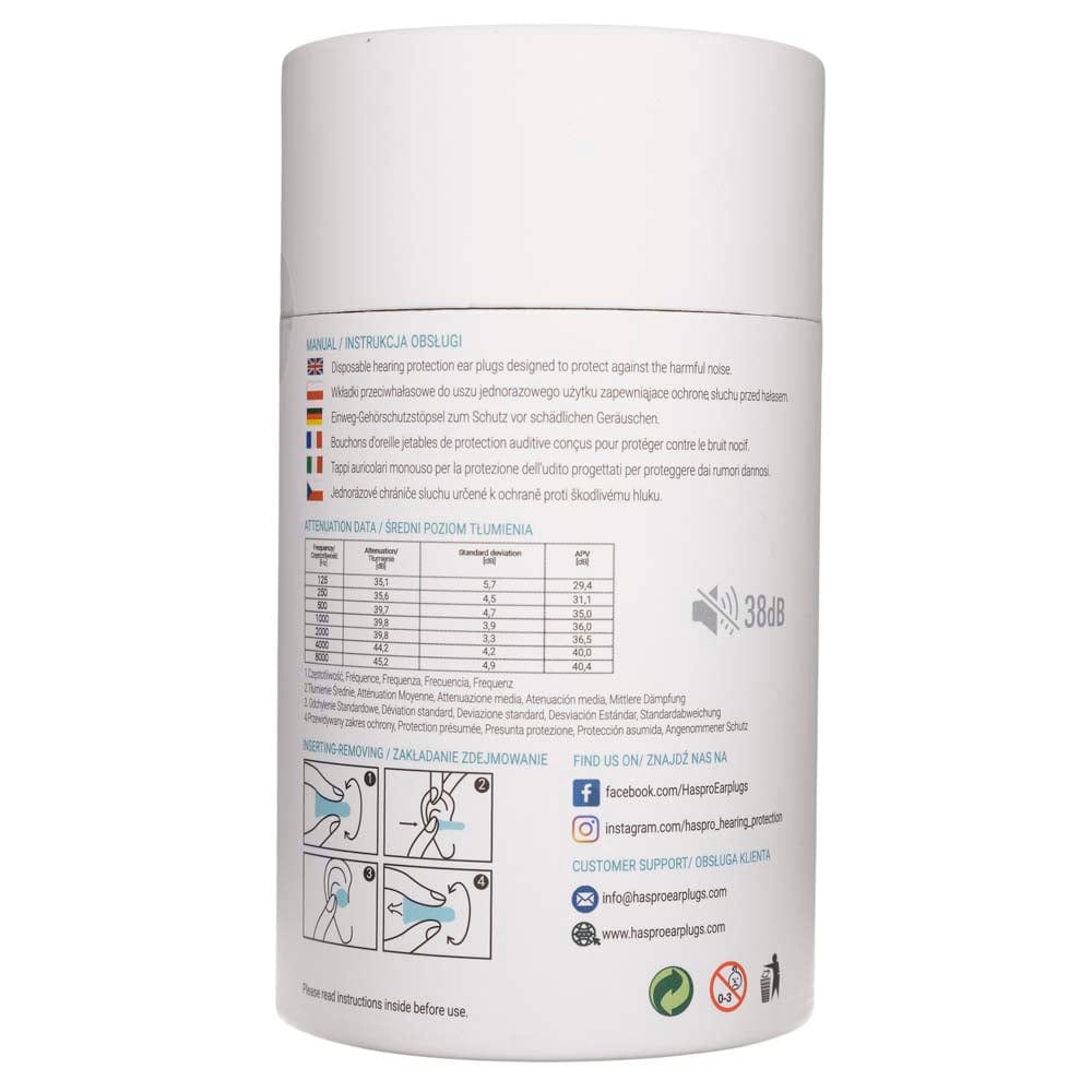 Haspro Tube50 è una moderna confezione a forma di tubo contenente 50 paia di tappi per le orecchie monouso realizzati in schiuma di poliuretano confortevole ed estremamente delicata, che si adatta molto facilmente a ciascun orecchio in meno di un minuto. Inoltre, ogni set è dotato di un piccolo contenitore per riporre i tappi per le orecchie.