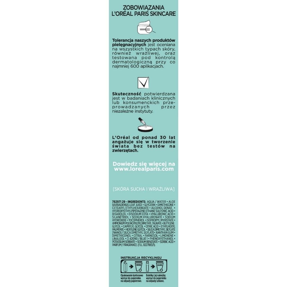 Aqua / Acqua, Succo di foglie di Aloe Barbadensis (sok ze świeżych liści aloesu), Glicerina (gliceryna), Dimeticone, Cetearyl Ethylhexanoate, Alcohol Denat, Hydroxyethylpiperazine Ethane Sulfonic Acid, Bisabololo (bisabololo), Disodio Edta, Acido ialuronico (kwas hialuronowy), Silanetriolo, Sodio ialuronato (sól sodowa kwasu hialuronowego), Idrossido di sodio, Tocoferolo (witamina E), Isopropyl Myristate, Ammonium Polyacryloyldimethyl Taurate, Butylene Glycol, Caprylyl Glycol (glikol kaprylowy), Citric Acid (kwas cytrynowy), Ethylhexyl Palmitate, Hexylene Glycol, Silica Dimethyl Silylate [Nano] / Silica Dimethyl Silylate, Xanthan Gum, Dimethiconol, Citral, Farnesol, Limonene, Linalool, CI 42090 / Blu 1, Fenossietanolo, Potassio Sorbato, Sodio Benzoato, Acido Sorbico, Parfum / Fragranza (F.I.L B227883/1).