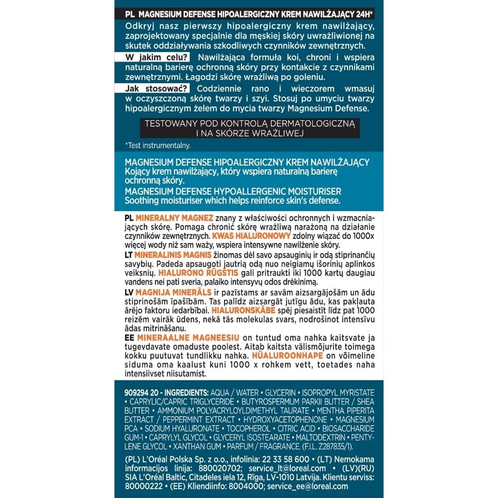 L'Oréal Paris Men Expert Magnesium Defense Hypoallergenic Moisturising Cream è una crema intensamente idratante appositamente formulata per gli uomini con pelle sensibile. Grazie al suo contenuto di magnesio e acido ialuronico, la crema lenisce, idrata e rafforza la barriera naturale della pelle per proteggerla dall'inquinamento e dalle irritazioni, soprattutto dopo la rasatura.