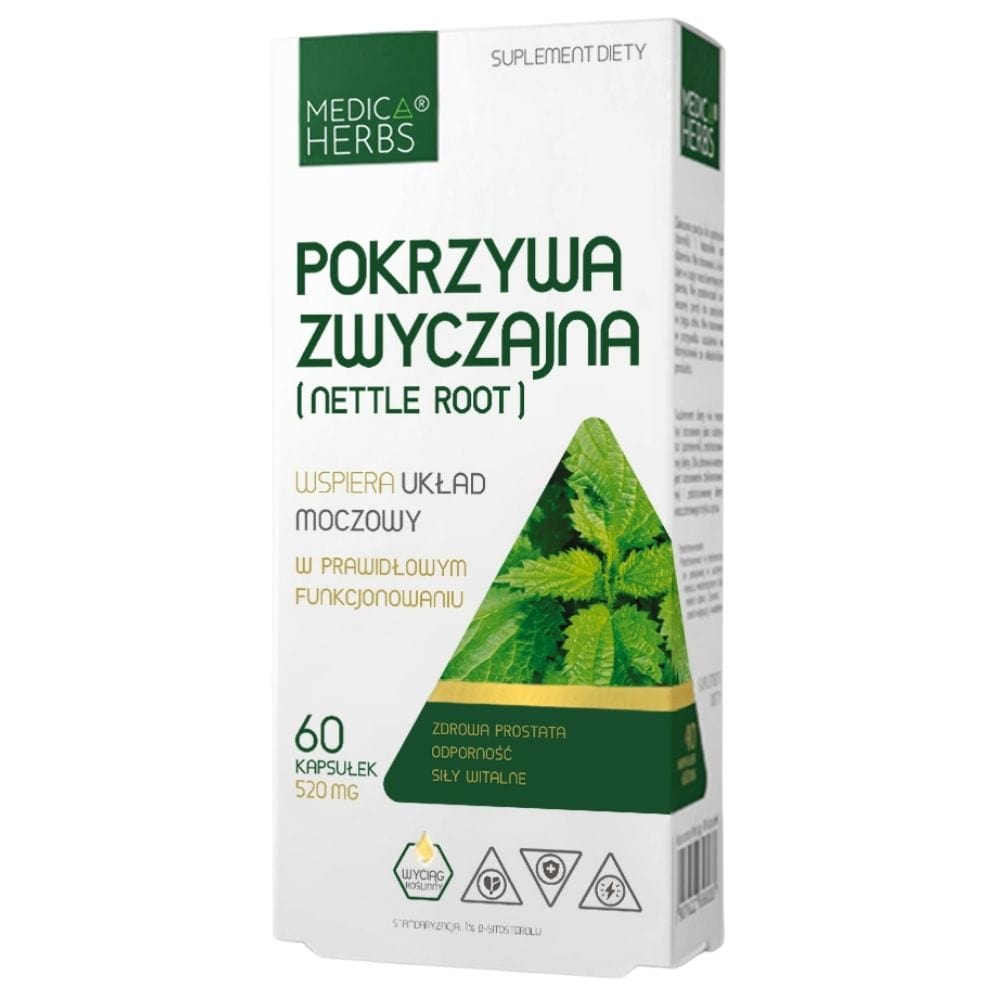 Medica Herbs Ortica comune (Radice di Ortica) è un integratore alimentare in capsule. Fonte di estratto di radice di Urtica dioica , standardizzato all'1% di β-sitosterolo . Fornisce 520 mg di estratto di radice di ortica in 1 capsula.
