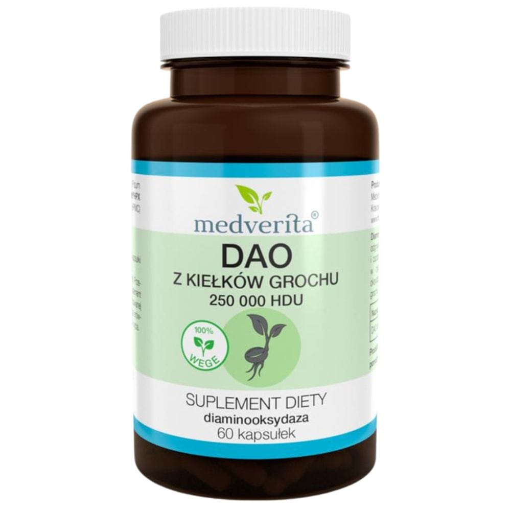 Medverita DAO dai germogli di piselli è un integratore alimentare altamente concentrato in capsule, contenente ben 250,000 HDU di diaminasi (DAO) in una capsula. Questo enzima svolge un ruolo chiave nella degradazione dell'istamina, proteggendo l'organismo dal suo eccesso e dai sintomi che lo accompagnano, come mal di testa, orticaria, e problemi digestivi.
