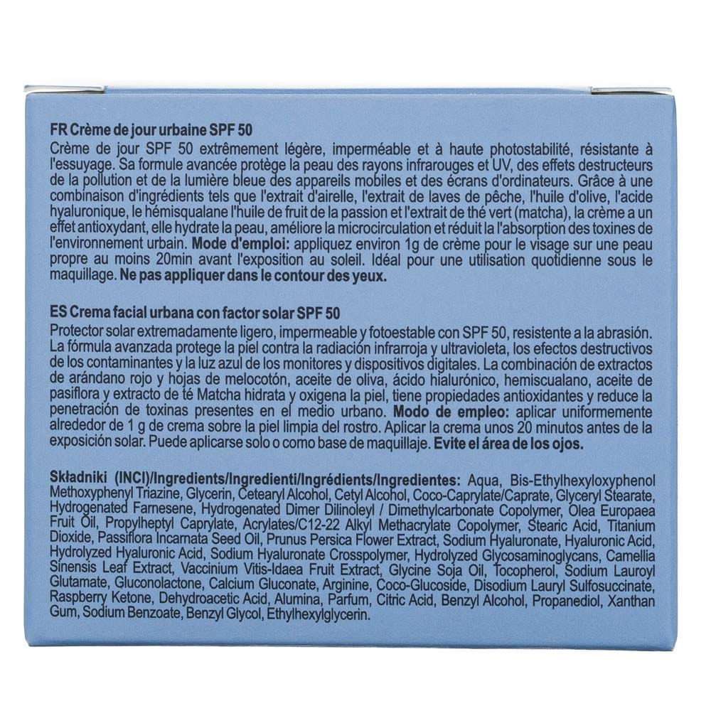 Crema eccezionalmente leggera,impermeabile e fotostabilecon protezione solare SPF 50. La formula avanzata protegge la pelle dalleradiazioni in frarossee UV, dagli effetti distruttivi delle sostanze inquinantie dalla luce blu dei dispositivi digitalie dei monitor.