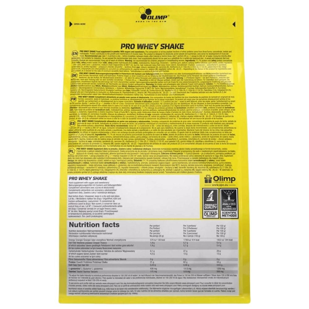 Olimp Pro Whey Shake è un integratore alimentare in polvere. È un integratore proteico creato per le persone con un aumentato fabbisogno proteico finalizzato allo sviluppo della massa muscolare, soprattutto per gli atleti professionisti e per chi pratica attività fisica a livello amatoriale. Combina tre fonti di proteine: idrolizzato, isolato e concentrato di siero di latte.