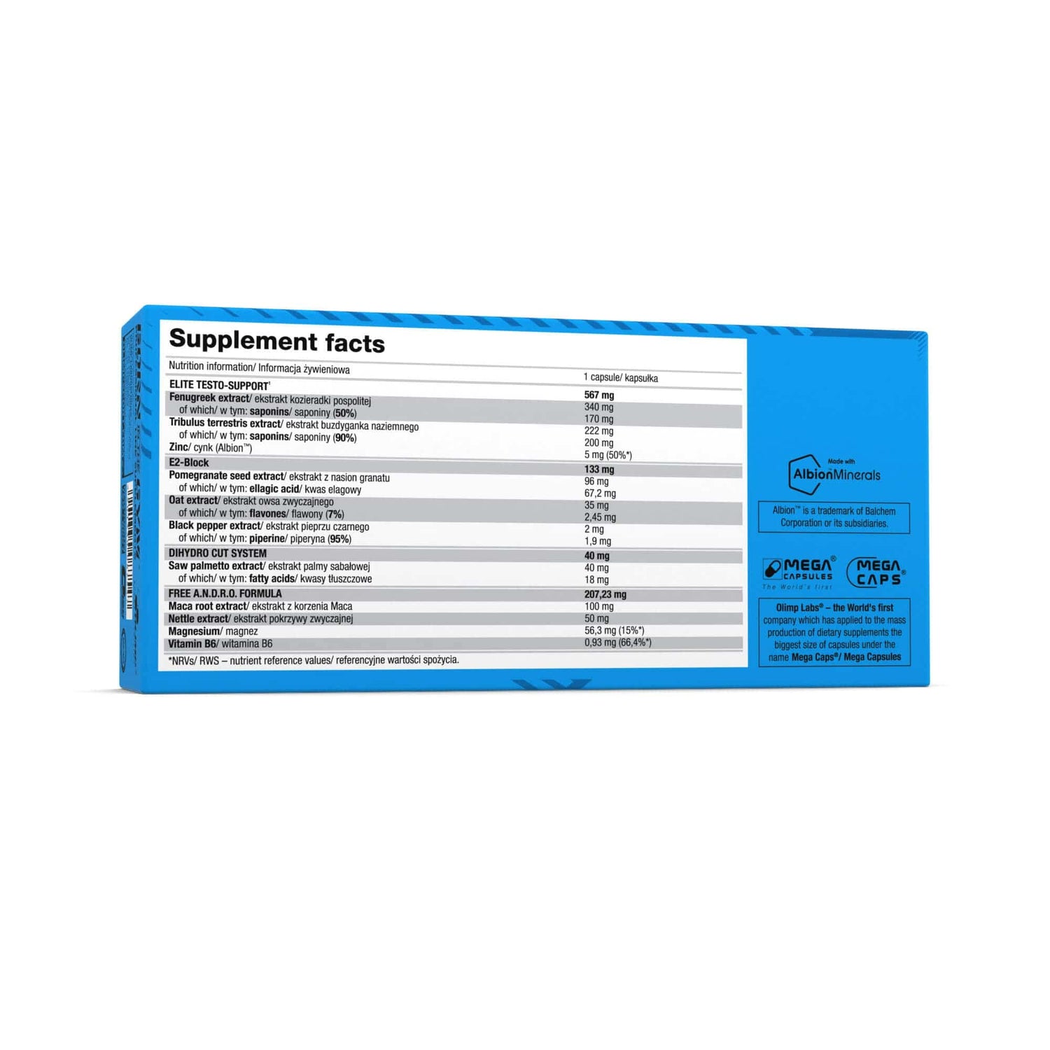 Estratto di semi di fieno greco (Trigonella foenum-graecum L.), Estratto di frutto di Tribulus terrestris (Tribulus terrestris L.; 90% saponine), Estratto di radice di maca (Lepidjum meyenii Walp.), malato di magnesio, Estratto di semi di melograno (Punica granatum L.), Estratto di frutto di Tribulus terrestris (Tribulus terrestris L.; 60% saponine), agente di carica — cellulosa microcristallina; estratto di ortica (Urtica dioica L.), estratto di frutto di palma nana (Serenoa repens), estratto di avena (Avena sativa L.), agenti antiagglomeranti — sali di magnesio di acidi grassi, biossido di silicio; bisglicinato di zinco (chelato di zinco e aminoacidi Albion™), estratto di frutto di pepe nero (Piper nigrum L.), piridossina cloridrato — vit. B6, capsula (gelatina, colorante: E 132).