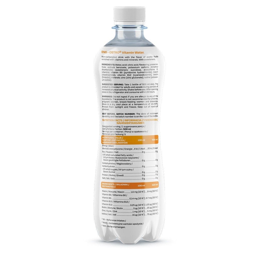 Ostrovit OSTRO ® L'Acqua Vitaminica è una bevanda non gassata a basso contenuto energetico che fornisce all'organismo preziose vitamine e minerali. È un prodotto al gusto di frutta esotica senza zuccheri aggiunti, creato per gli atleti e per le persone con una maggiore richiesta di preziosi micronutrienti.