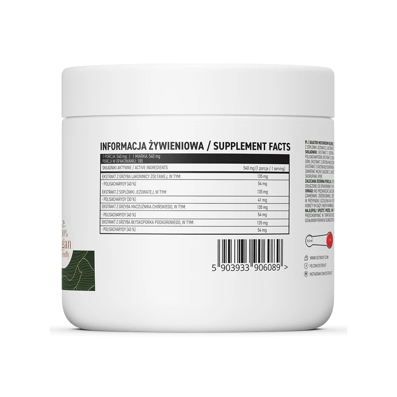 Ostrovit Quatro Mushroom Blend Vege è una combinazione unica di estratti di quattro diversi funghi: tordo giallo, coneflower, macis cinese e spinneret subclavi. Si tratta di un preparato disponibile in una comoda forma di polvere, creato per le persone che desiderano integrare la propria dieta con ingredienti naturali, di valore. Il preparato è vegano e privo di, additivi inutili.