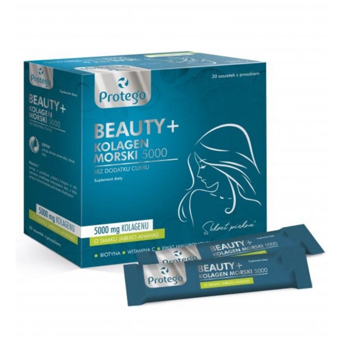Protego BEAUTY + Marine Collagen 5000 è un integratore alimentare in polvere in comode bustine. Una bustina fornisce ben 5,000 mg di collagene, vitamina C, acido ialuronico e biotina.