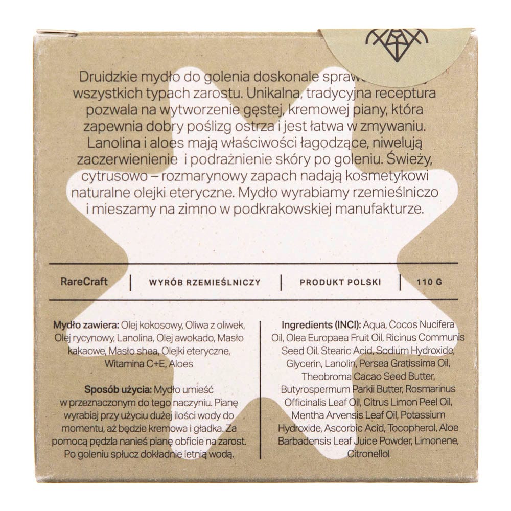 La lanolina e l'aloe vera hanno proprietà lenitive, eliminando arrossamenti e irritazioni della pelle dopo la rasatura. Il fresco profumo, di agrumi e rosmarino è conferito al cosmetico dagli oli essenziali naturali. Gli oli di avocado e ricino nutrono e idratano la pelle, e ne regolano il pH. Il sapone da barba Druid è privo di conservanti artificiali e di sostanze irritanti ed è quindi adatto anche a chi è soggetto ad allergie e irritazioni. La sua ricetta unica e la sua lavorazione artigianale lo rendono un cosmetico polacco, unico.