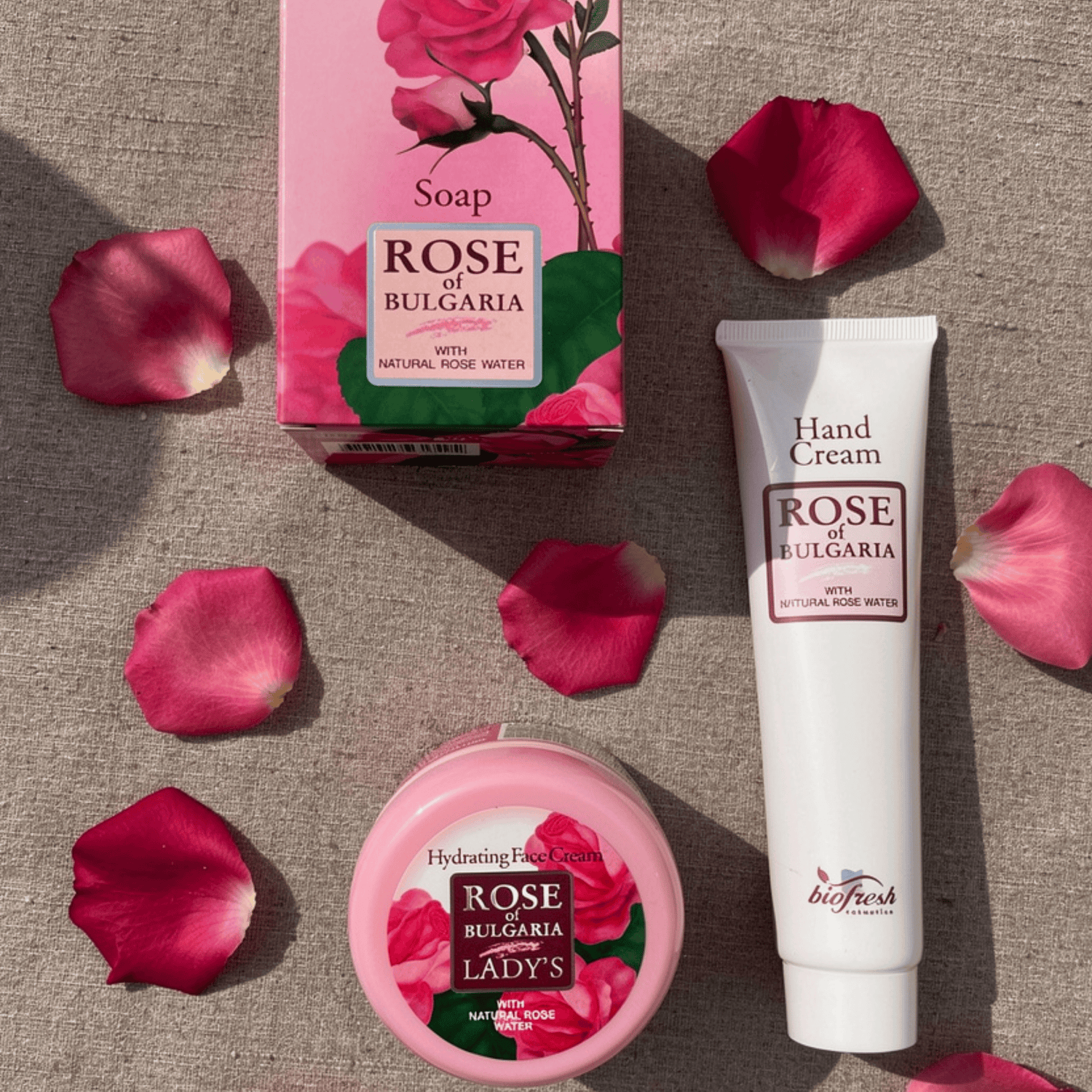 - Rose of Bulgaria Moisturising Cream – 100 ml – a daily face and body cream with jojoba oil, panthenol and vitamin E that deeply hydrates and helps maintain a smooth, supple complexion.