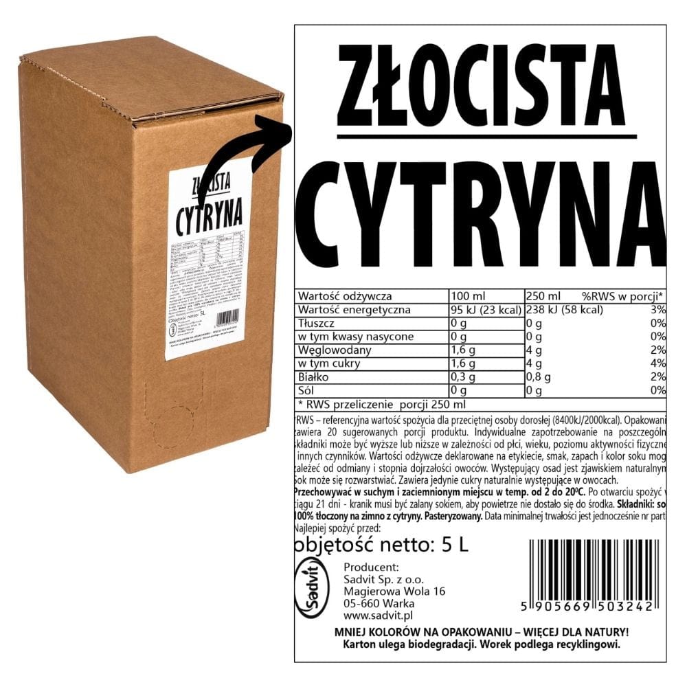 Il succo di limone Sadvit Golden Lemon 100% è NFC (non da concentrato) succo spremuto a freddo contenente solo limoni. Pastorizzato, senza zuccheri aggiunti o esaltatori di sapidità.