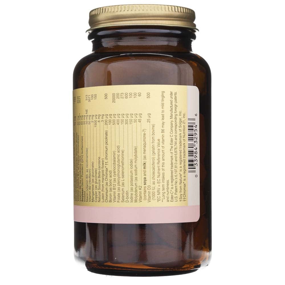 Calcio (citrato, ascorbato), agenti di carica: Cellulosa microcristallina, fosfato bicalcico, alginato, amido di pisello, destrina, idrossipropilcellulosa, amido alimentare modificato, magnesio (come citrato, ossido), Vitamina C (come estere.C, ascorbato di calcio), Vitamina E (come D-alfa tocoferile succinato), complesso di bioflavonoidi di agrumi, sostanze antiagglomeranti: acido stearico vegetale, biossido di silicio, magnesio stearato vegetale, gomma di cellulosa, colina (come diquinato), agenti di rivestimento: idrossipropilmetilcellulosa, glicerina vegetale (da olio di palmisto e olio di cocco), Acido pantotenico (come D-pantotenato, calcio), Zinco (come picolinato), Colori: Polvere di carote viola, Biossido di titanio, Tiamina (vitamina B1 come tiamina mononitrato), Vitamina B6 (come piridossina HCl), Germe di soia in polvere ([2%] isoflavoni), Inositolo, niacina (vitamina B3, come nicotinamide), vitamina B2 (riboflavina), manganese (come gluconato), rame (come gluconato), fonte naturale di beta-carotene, Luteina (da fiori di calendula), Cromo (come C hromax, cromo picolinato), boro (come acido borico), acido borico), vitamina B12 (come cianocobalamina), folato (come acido pteroilmonoglutammico), selenio (come L-selenometionina), D-biotina, iodio (come ioduro di potassio), molibdeno (come molibdato di sodio), vitamina K2 (contiene soia e latte) (come menachinone-7), vitamina D3 (come colecalciferolo) (gelatina di manzo).