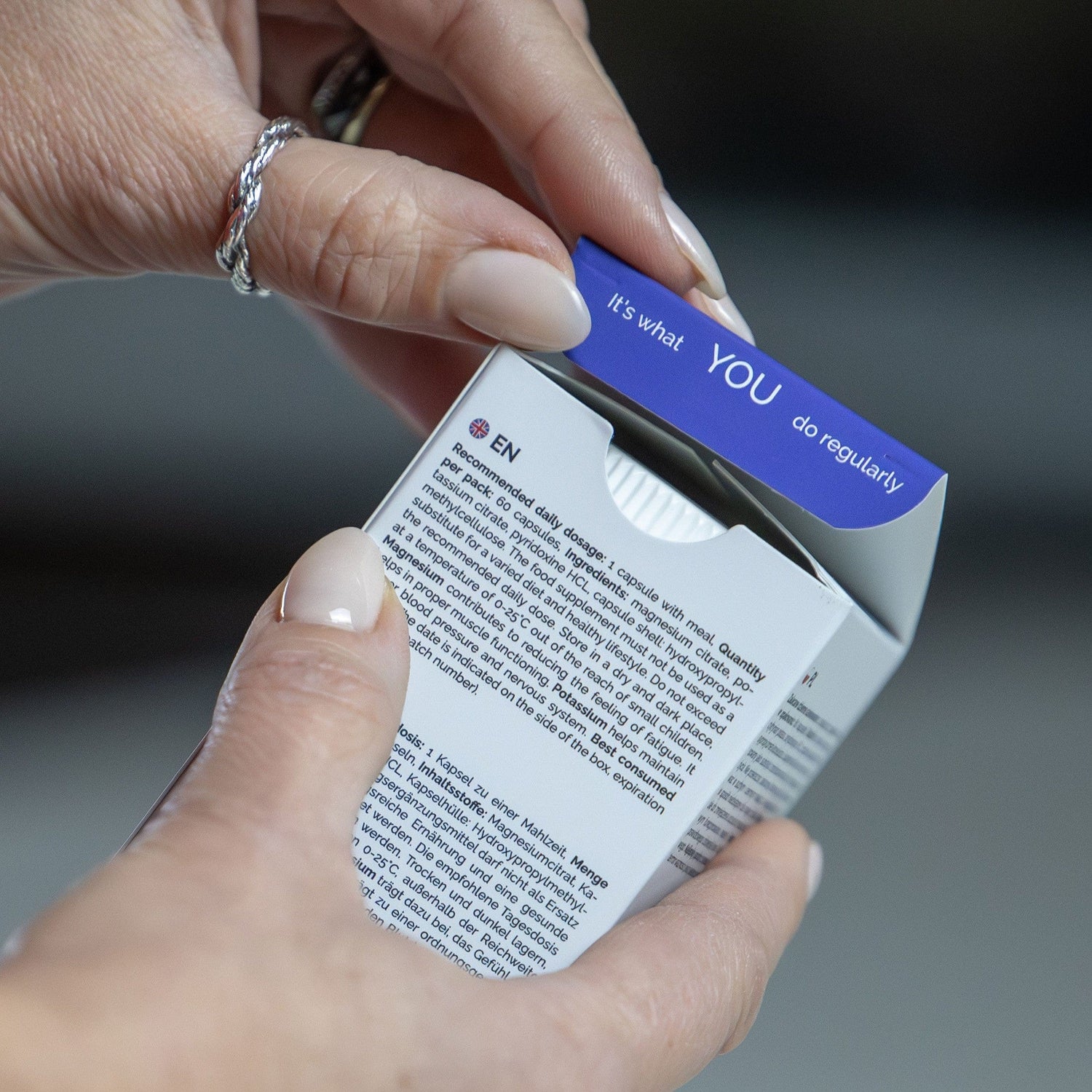 Il prodotto fornisce 1 00 mg di magnesio,150 mg di potassio, e 6 mg di vitamina B6. Composizione pura, senza additivi superflui. Adatto per vegani.