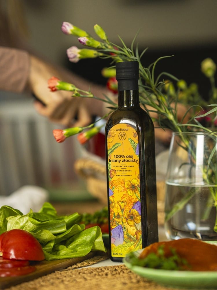 L'olio di semi di lino dorato è noto principalmente per il suo alto contenuto di acidi grassi omega 3 e omega 6 , che appartengono al gruppo degli acidi grassi essenziali. Queste sostanze hanno un effetto benefico sul funzionamento di molti sistemi dell'organismo umano, tra cui, soprattutto, il corretto funzionamento del sistema immunitario e dell'apparato digerente. Gli acidi grassi essenziali regolano il metabolismo e il livello di colesterolo, contribuendo così alla prevenzione dell'aterosclerosi, dell'ipertensione e delle malattie cardiache. Inoltre, l'olio di semi di lino ha un effetto protettivo sul tratto digestivo e fornisce all'organismo vitamine liposolubili A, D, E e K.